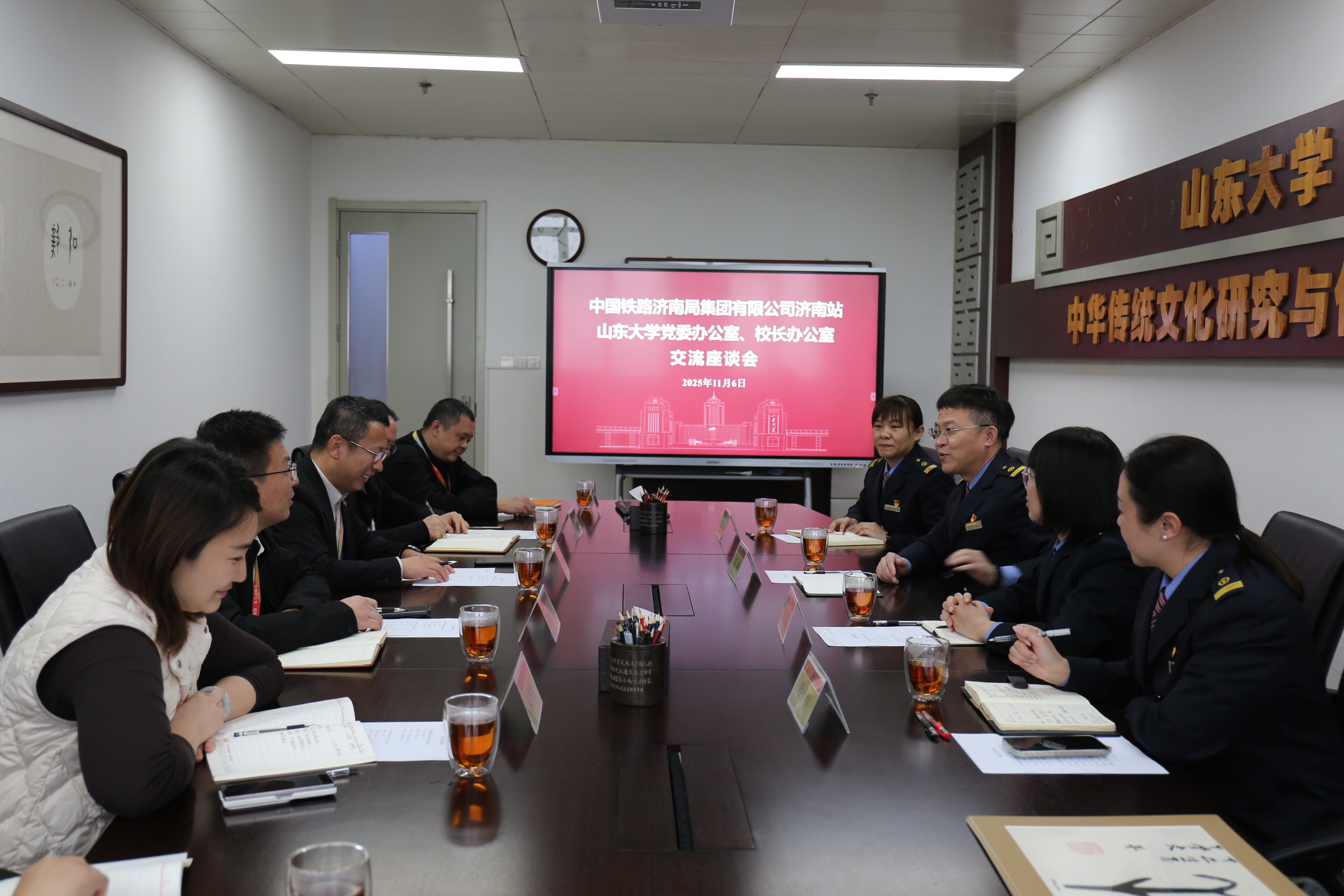 为深化路校合作,共谋协同发展,中国铁路济南局集团有限公司济南站与山东大学党委办公室、校长办公室于11月6日下午在山东大学举行了交流座谈会。